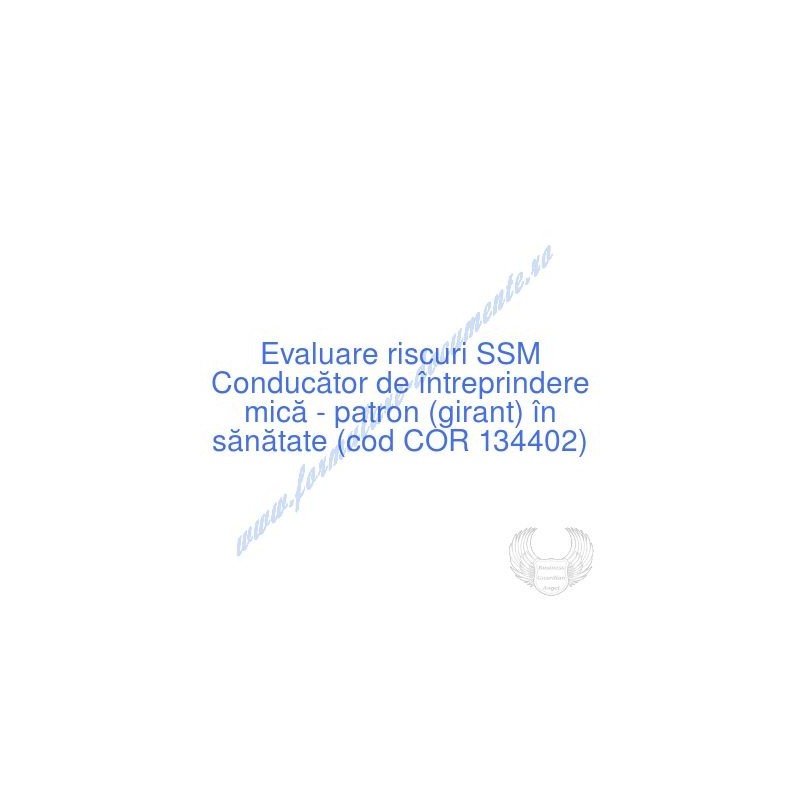 Aceste documente OBLIGATORII pentru ocupantul postului de Conducător de întreprindere mică - patron (girant) în sănătate (cod COR 134402), sunt complet întocmite, respectând cerințele Codului muncii actualizat 2023, Legii securității și sănătății în muncă nr. 319/2006 (actualizată 2023), răspund tuturor cerințelor standardelor de calitate referitoare la management (ISO 9001/ ISO 14001/ ISO 22000/ SR OHSAS 18001:2008/ ISO 45001:2018 etc.). În vederea determinării riscurilor la care este expus angajatul pe funcția de Conducător de întreprindere mică - patron (girant) în sănătate , consecințele maxime previzibile asupra acestuia și metodele de diminuare a lor am folosit metoda elaborată de I.N.C.D.P.M. București, care respectă toate rigorile legale și este unanim acceptată de inspectorii ITM și SSM.