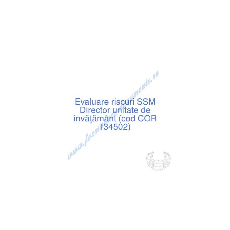 Aceste documente OBLIGATORII pentru ocupantul postului de Director unitate de învăţământ (cod COR 134502), sunt complet întocmite, respectând cerințele Codului muncii actualizat 2023, Legii securității și sănătății în muncă nr. 319/2006 (actualizată 2023), răspund tuturor cerințelor standardelor de calitate referitoare la management (ISO 9001/ ISO 14001/ ISO 22000/ SR OHSAS 18001:2008/ ISO 45001:2018 etc.). În vederea determinării riscurilor la care este expus angajatul pe funcția de Director unitate de învăţământ , consecințele maxime previzibile asupra acestuia și metodele de diminuare a lor am folosit metoda elaborată de I.N.C.D.P.M. București, care respectă toate rigorile legale și este unanim acceptată de inspectorii ITM și SSM.