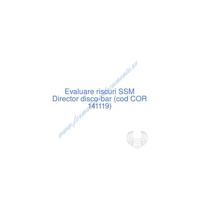 Aceste documente OBLIGATORII pentru ocupantul postului de Director disco-bar (cod COR 141119), sunt complet întocmite, respectând cerințele Codului muncii actualizat 2023, Legii securității și sănătății în muncă nr. 319/2006 (actualizată 2023), răspund tuturor cerințelor standardelor de calitate referitoare la management (ISO 9001/ ISO 14001/ ISO 22000/ SR OHSAS 18001:2008/ ISO 45001:2018 etc.). În vederea determinării riscurilor la care este expus angajatul pe funcția de Director disco-bar , consecințele maxime previzibile asupra acestuia și metodele de diminuare a lor am folosit metoda elaborată de I.N.C.D.P.M. București, care respectă toate rigorile legale și este unanim acceptată de inspectorii ITM și SSM.