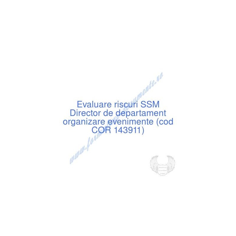 Aceste documente OBLIGATORII pentru ocupantul postului de Director de departament organizare evenimente (cod COR 143911), sunt complet întocmite, respectând cerințele Codului muncii actualizat 2023, Legii securității și sănătății în muncă nr. 319/2006 (actualizată 2023), răspund tuturor cerințelor standardelor de calitate referitoare la management (ISO 9001/ ISO 14001/ ISO 22000/ SR OHSAS 18001:2008/ ISO 45001:2018 etc.). În vederea determinării riscurilor la care este expus angajatul pe funcția de Director de departament organizare evenimente , consecințele maxime previzibile asupra acestuia și metodele de diminuare a lor am folosit metoda elaborată de I.N.C.D.P.M. București, care respectă toate rigorile legale și este unanim acceptată de inspectorii ITM și SSM.