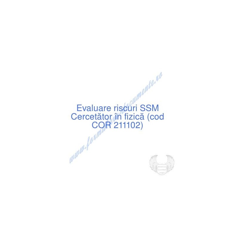 Aceste documente OBLIGATORII pentru ocupantul postului de Cercetător în fizică (cod COR 211102), sunt complet întocmite, respectând cerințele Codului muncii actualizat 2023, Legii securității și sănătății în muncă nr. 319/2006 (actualizată 2023), răspund tuturor cerințelor standardelor de calitate referitoare la management (ISO 9001/ ISO 14001/ ISO 22000/ SR OHSAS 18001:2008/ ISO 45001:2018 etc.). În vederea determinării riscurilor la care este expus angajatul pe funcția de Cercetător în fizică , consecințele maxime previzibile asupra acestuia și metodele de diminuare a lor am folosit metoda elaborată de I.N.C.D.P.M. București, care respectă toate rigorile legale și este unanim acceptată de inspectorii ITM și SSM.