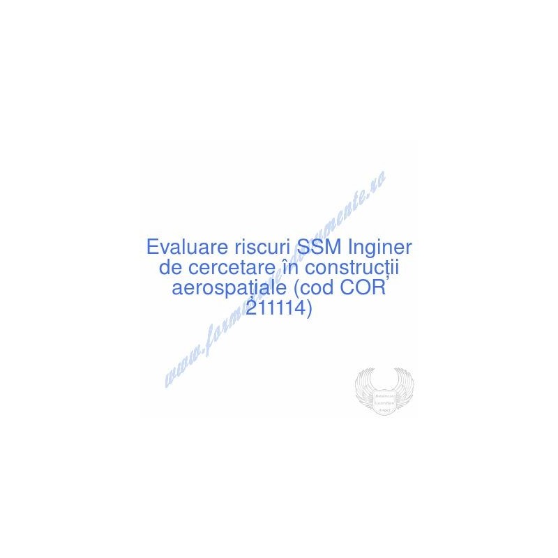 Aceste documente OBLIGATORII pentru ocupantul postului de Inginer de cercetare în construcţii aerospaţiale (cod COR 211114), sunt complet întocmite, respectând cerințele Codului muncii actualizat 2023, Legii securității și sănătății în muncă nr. 319/2006 (actualizată 2023), răspund tuturor cerințelor standardelor de calitate referitoare la management (ISO 9001/ ISO 14001/ ISO 22000/ SR OHSAS 18001:2008/ ISO 45001:2018 etc.). În vederea determinării riscurilor la care este expus angajatul pe funcția de Inginer de cercetare în construcţii aerospaţiale , consecințele maxime previzibile asupra acestuia și metodele de diminuare a lor am folosit metoda elaborată de I.N.C.D.P.M. București, care respectă toate rigorile legale și este unanim acceptată de inspectorii ITM și SSM.
