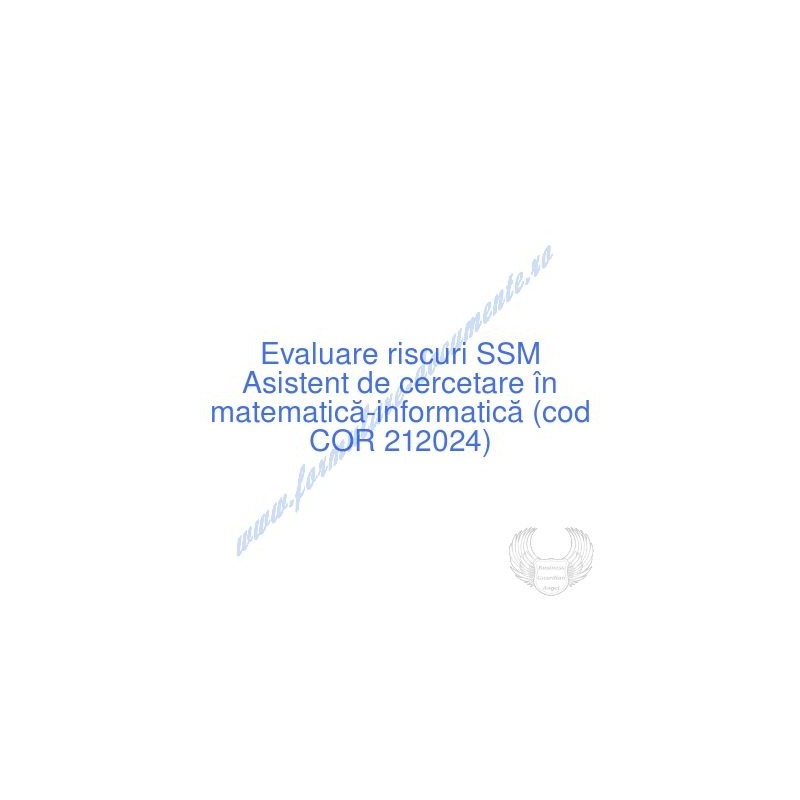 Aceste documente OBLIGATORII pentru ocupantul postului de Asistent de cercetare în matematică-informatică (cod COR 212024), sunt complet întocmite, respectând cerințele Codului muncii actualizat 2023, Legii securității și sănătății în muncă nr. 319/2006 (actualizată 2023), răspund tuturor cerințelor standardelor de calitate referitoare la management (ISO 9001/ ISO 14001/ ISO 22000/ SR OHSAS 18001:2008/ ISO 45001:2018 etc.). În vederea determinării riscurilor la care este expus angajatul pe funcția de Asistent de cercetare în matematică-informatică , consecințele maxime previzibile asupra acestuia și metodele de diminuare a lor am folosit metoda elaborată de I.N.C.D.P.M. București, care respectă toate rigorile legale și este unanim acceptată de inspectorii ITM și SSM.