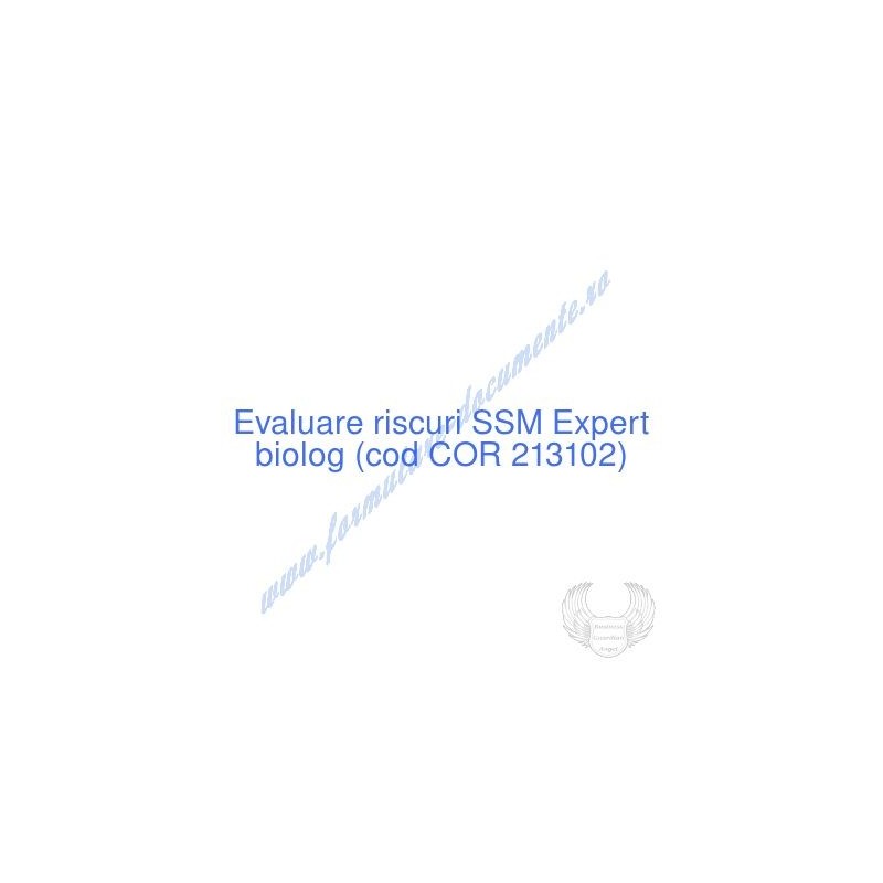Aceste documente OBLIGATORII pentru ocupantul postului de Expert biolog (cod COR 213102), sunt complet întocmite, respectând cerințele Codului muncii actualizat 2023, Legii securității și sănătății în muncă nr. 319/2006 (actualizată 2023), răspund tuturor cerințelor standardelor de calitate referitoare la management (ISO 9001/ ISO 14001/ ISO 22000/ SR OHSAS 18001:2008/ ISO 45001:2018 etc.). În vederea determinării riscurilor la care este expus angajatul pe funcția de Expert biolog , consecințele maxime previzibile asupra acestuia și metodele de diminuare a lor am folosit metoda elaborată de I.N.C.D.P.M. București, care respectă toate rigorile legale și este unanim acceptată de inspectorii ITM și SSM.