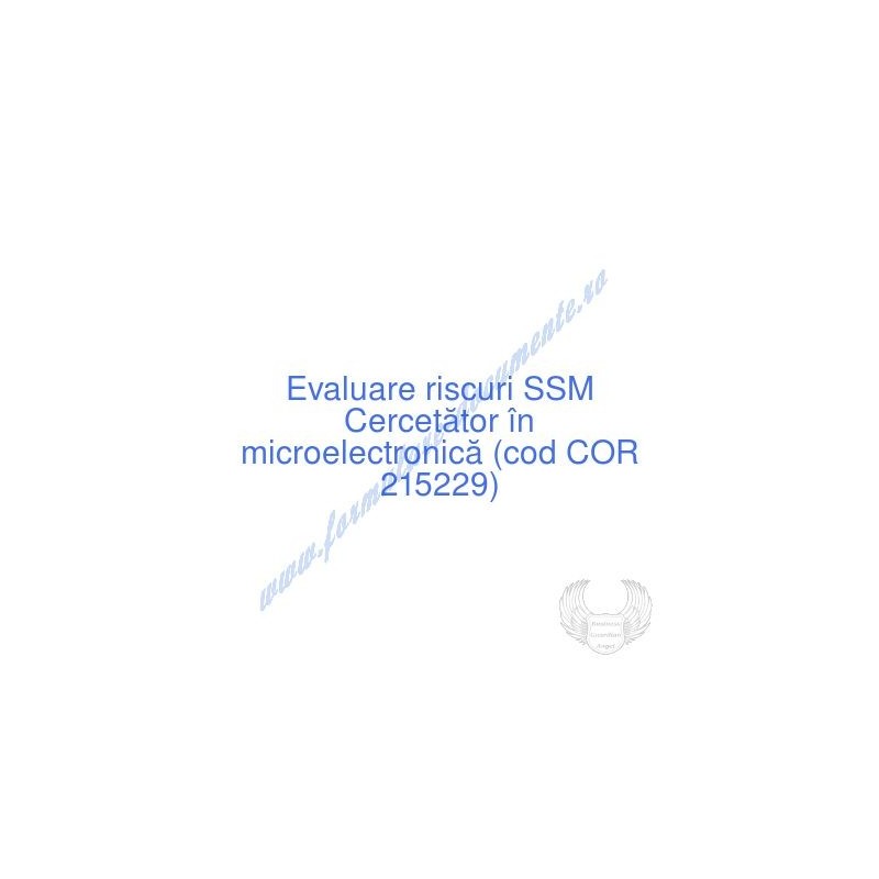 Aceste documente OBLIGATORII pentru ocupantul postului de Cercetător în microelectronică (cod COR 215229), sunt complet întocmite, respectând cerințele Codului muncii actualizat 2023, Legii securității și sănătății în muncă nr. 319/2006 (actualizată 2023), răspund tuturor cerințelor standardelor de calitate referitoare la management (ISO 9001/ ISO 14001/ ISO 22000/ SR OHSAS 18001:2008/ ISO 45001:2018 etc.). În vederea determinării riscurilor la care este expus angajatul pe funcția de Cercetător în microelectronică , consecințele maxime previzibile asupra acestuia și metodele de diminuare a lor am folosit metoda elaborată de I.N.C.D.P.M. București, care respectă toate rigorile legale și este unanim acceptată de inspectorii ITM și SSM.
