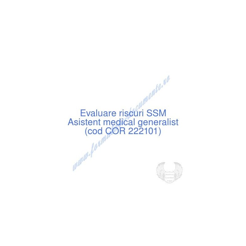 Aceste documente OBLIGATORII pentru ocupantul postului de Asistent medical generalist (cod COR 222101), sunt complet întocmite, respectând cerințele Codului muncii actualizat 2023, Legii securității și sănătății în muncă nr. 319/2006 (actualizată 2023), răspund tuturor cerințelor standardelor de calitate referitoare la management (ISO 9001/ ISO 14001/ ISO 22000/ SR OHSAS 18001:2008/ ISO 45001:2018 etc.). În vederea determinării riscurilor la care este expus angajatul pe funcția de Asistent medical generalist , consecințele maxime previzibile asupra acestuia și metodele de diminuare a lor am folosit metoda elaborată de I.N.C.D.P.M. București, care respectă toate rigorile legale și este unanim acceptată de inspectorii ITM și SSM.