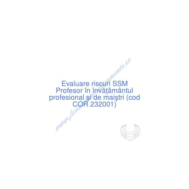 Aceste documente OBLIGATORII pentru ocupantul postului de Profesor în învăţământul profesional şi de maiştri (cod COR 232001), sunt complet întocmite, respectând cerințele Codului muncii actualizat 2023, Legii securității și sănătății în muncă nr. 319/2006 (actualizată 2023), răspund tuturor cerințelor standardelor de calitate referitoare la management (ISO 9001/ ISO 14001/ ISO 22000/ SR OHSAS 18001:2008/ ISO 45001:2018 etc.). În vederea determinării riscurilor la care este expus angajatul pe funcția de Profesor în învăţământul profesional şi de maiştri , consecințele maxime previzibile asupra acestuia și metodele de diminuare a lor am folosit metoda elaborată de I.N.C.D.P.M. București, care respectă toate rigorile legale și este unanim acceptată de inspectorii ITM și SSM.