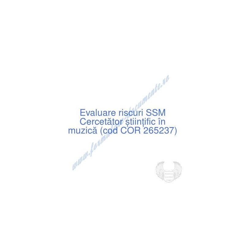 Aceste documente OBLIGATORII pentru ocupantul postului de Cercetător științific în muzică (cod COR 265237), sunt complet întocmite, respectând cerințele Codului muncii actualizat 2023, Legii securității și sănătății în muncă nr. 319/2006 (actualizată 2023), răspund tuturor cerințelor standardelor de calitate referitoare la management (ISO 9001/ ISO 14001/ ISO 22000/ SR OHSAS 18001:2008/ ISO 45001:2018 etc.). În vederea determinării riscurilor la care este expus angajatul pe funcția de Cercetător științific în muzică , consecințele maxime previzibile asupra acestuia și metodele de diminuare a lor am folosit metoda elaborată de I.N.C.D.P.M. București, care respectă toate rigorile legale și este unanim acceptată de inspectorii ITM și SSM.