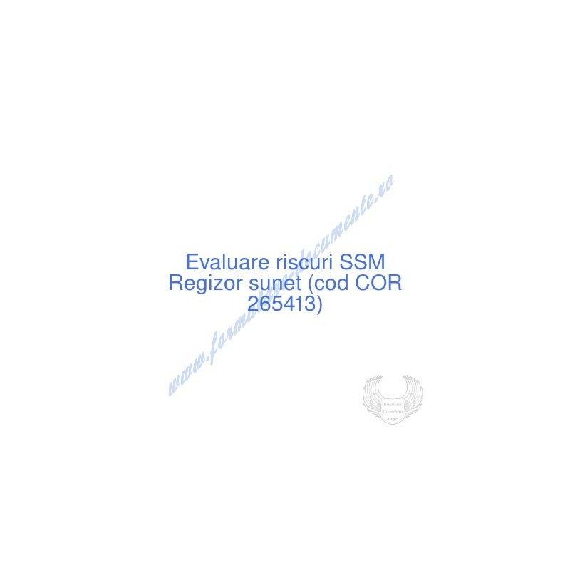 Aceste documente OBLIGATORII pentru ocupantul postului de Regizor sunet (cod COR 265413), sunt complet întocmite, respectând cerințele Codului muncii actualizat 2023, Legii securității și sănătății în muncă nr. 319/2006 (actualizată 2023), răspund tuturor cerințelor standardelor de calitate referitoare la management (ISO 9001/ ISO 14001/ ISO 22000/ SR OHSAS 18001:2008/ ISO 45001:2018 etc.). În vederea determinării riscurilor la care este expus angajatul pe funcția de Regizor sunet , consecințele maxime previzibile asupra acestuia și metodele de diminuare a lor am folosit metoda elaborată de I.N.C.D.P.M. București, care respectă toate rigorile legale și este unanim acceptată de inspectorii ITM și SSM.
