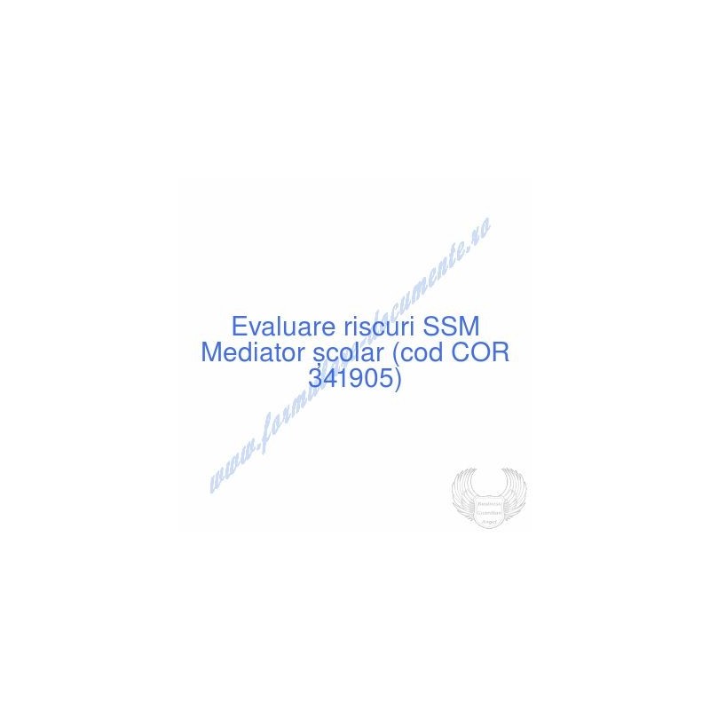 Aceste documente OBLIGATORII pentru ocupantul postului de Mediator școlar (cod COR 341905), sunt complet întocmite, respectând cerințele Codului muncii actualizat 2023, Legii securității și sănătății în muncă nr. 319/2006 (actualizată 2023), răspund tuturor cerințelor standardelor de calitate referitoare la management (ISO 9001/ ISO 14001/ ISO 22000/ SR OHSAS 18001:2008/ ISO 45001:2018 etc.). În vederea determinării riscurilor la care este expus angajatul pe funcția de Mediator școlar , consecințele maxime previzibile asupra acestuia și metodele de diminuare a lor am folosit metoda elaborată de I.N.C.D.P.M. București, care respectă toate rigorile legale și este unanim acceptată de inspectorii ITM și SSM.