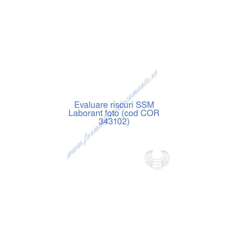 Aceste documente OBLIGATORII pentru ocupantul postului de Laborant foto (cod COR 343102), sunt complet întocmite, respectând cerințele Codului muncii actualizat 2023, Legii securității și sănătății în muncă nr. 319/2006 (actualizată 2023), răspund tuturor cerințelor standardelor de calitate referitoare la management (ISO 9001/ ISO 14001/ ISO 22000/ SR OHSAS 18001:2008/ ISO 45001:2018 etc.). În vederea determinării riscurilor la care este expus angajatul pe funcția de Laborant foto , consecințele maxime previzibile asupra acestuia și metodele de diminuare a lor am folosit metoda elaborată de I.N.C.D.P.M. București, care respectă toate rigorile legale și este unanim acceptată de inspectorii ITM și SSM.