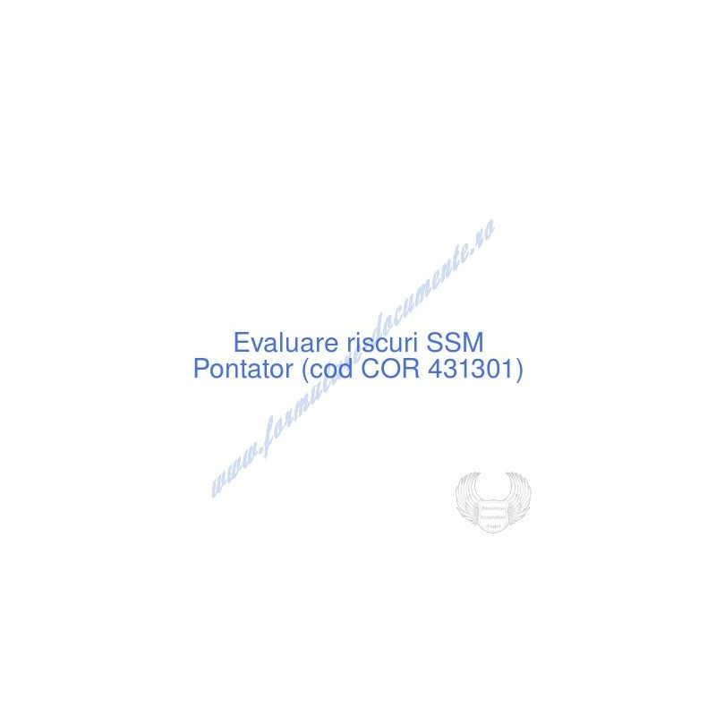 Aceste documente OBLIGATORII pentru ocupantul postului de Pontator (cod COR 431301), sunt complet întocmite, respectând cerințele Codului muncii actualizat 2023, Legii securității și sănătății în muncă nr. 319/2006 (actualizată 2023), răspund tuturor cerințelor standardelor de calitate referitoare la management (ISO 9001/ ISO 14001/ ISO 22000/ SR OHSAS 18001:2008/ ISO 45001:2018 etc.). În vederea determinării riscurilor la care este expus angajatul pe funcția de Pontator , consecințele maxime previzibile asupra acestuia și metodele de diminuare a lor am folosit metoda elaborată de I.N.C.D.P.M. București, care respectă toate rigorile legale și este unanim acceptată de inspectorii ITM și SSM.