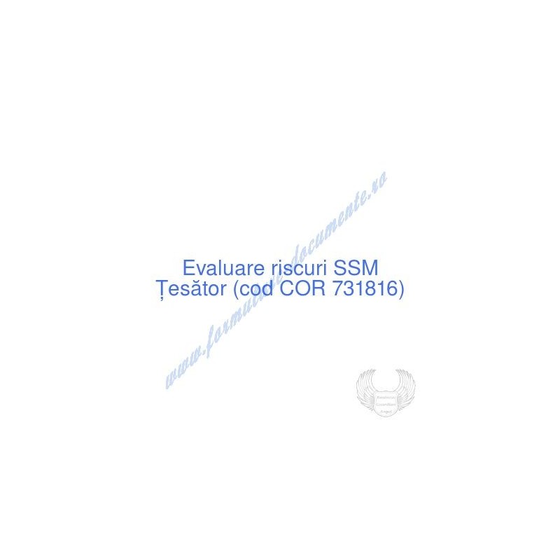 Aceste documente OBLIGATORII pentru ocupantul postului de Ţesător (cod COR 731816), sunt complet întocmite, respectând cerințele Codului muncii actualizat 2023, Legii securității și sănătății în muncă nr. 319/2006 (actualizată 2023), răspund tuturor cerințelor standardelor de calitate referitoare la management (ISO 9001/ ISO 14001/ ISO 22000/ SR OHSAS 18001:2008/ ISO 45001:2018 etc.). În vederea determinării riscurilor la care este expus angajatul pe funcția de Ţesător , consecințele maxime previzibile asupra acestuia și metodele de diminuare a lor am folosit metoda elaborată de I.N.C.D.P.M. București, care respectă toate rigorile legale și este unanim acceptată de inspectorii ITM și SSM.