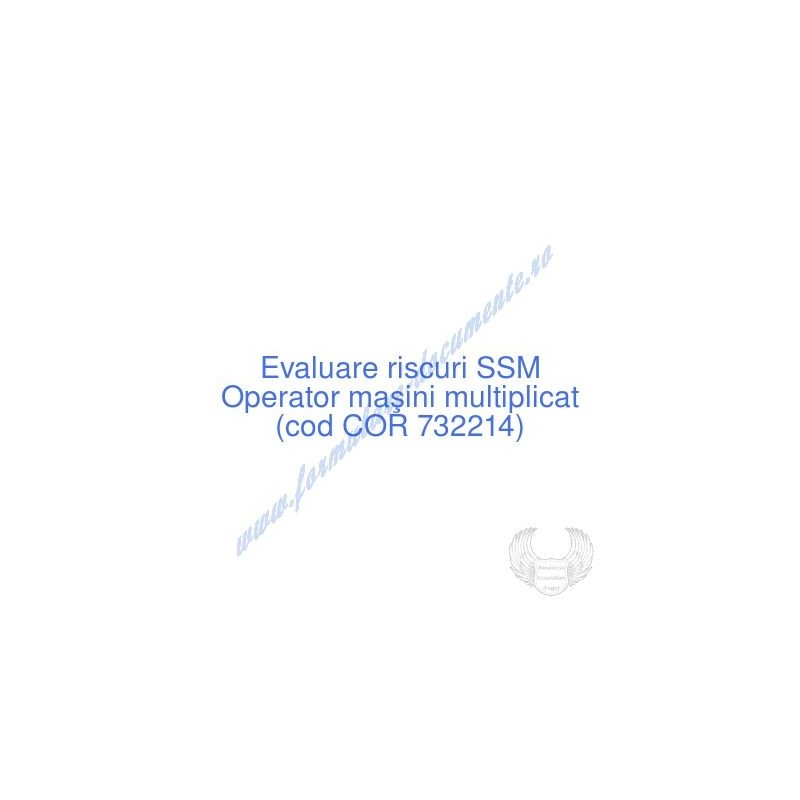 Aceste documente OBLIGATORII pentru ocupantul postului de Operator maşini multiplicat (cod COR 732214), sunt complet întocmite, respectând cerințele Codului muncii actualizat 2023, Legii securității și sănătății în muncă nr. 319/2006 (actualizată 2023), răspund tuturor cerințelor standardelor de calitate referitoare la management (ISO 9001/ ISO 14001/ ISO 22000/ SR OHSAS 18001:2008/ ISO 45001:2018 etc.). În vederea determinării riscurilor la care este expus angajatul pe funcția de Operator maşini multiplicat , consecințele maxime previzibile asupra acestuia și metodele de diminuare a lor am folosit metoda elaborată de I.N.C.D.P.M. București, care respectă toate rigorile legale și este unanim acceptată de inspectorii ITM și SSM.