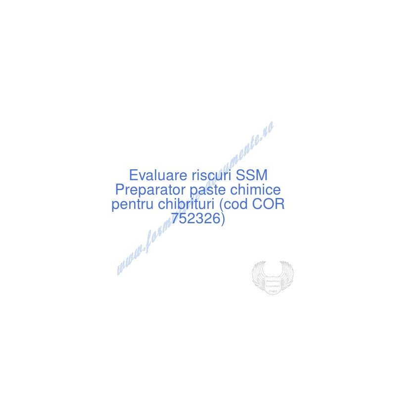 Aceste documente OBLIGATORII pentru ocupantul postului de Preparator paste chimice pentru chibrituri (cod COR 752326), sunt complet întocmite, respectând cerințele Codului muncii actualizat 2023, Legii securității și sănătății în muncă nr. 319/2006 (actualizată 2023), răspund tuturor cerințelor standardelor de calitate referitoare la management (ISO 9001/ ISO 14001/ ISO 22000/ SR OHSAS 18001:2008/ ISO 45001:2018 etc.). În vederea determinării riscurilor la care este expus angajatul pe funcția de Preparator paste chimice pentru chibrituri , consecințele maxime previzibile asupra acestuia și metodele de diminuare a lor am folosit metoda elaborată de I.N.C.D.P.M. București, care respectă toate rigorile legale și este unanim acceptată de inspectorii ITM și SSM.