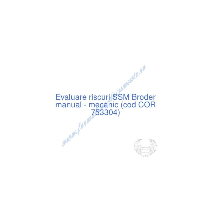 Aceste documente OBLIGATORII pentru ocupantul postului de Broder manual - mecanic (cod COR 753304), sunt complet întocmite, respectând cerințele Codului muncii actualizat 2023, Legii securității și sănătății în muncă nr. 319/2006 (actualizată 2023), răspund tuturor cerințelor standardelor de calitate referitoare la management (ISO 9001/ ISO 14001/ ISO 22000/ SR OHSAS 18001:2008/ ISO 45001:2018 etc.). În vederea determinării riscurilor la care este expus angajatul pe funcția de Broder manual - mecanic , consecințele maxime previzibile asupra acestuia și metodele de diminuare a lor am folosit metoda elaborată de I.N.C.D.P.M. București, care respectă toate rigorile legale și este unanim acceptată de inspectorii ITM și SSM.