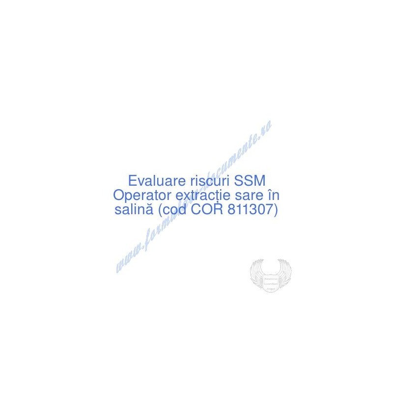 Aceste documente OBLIGATORII pentru ocupantul postului de Operator extracţie sare în salină (cod COR 811307), sunt complet întocmite, respectând cerințele Codului muncii actualizat 2023, Legii securității și sănătății în muncă nr. 319/2006 (actualizată 2023), răspund tuturor cerințelor standardelor de calitate referitoare la management (ISO 9001/ ISO 14001/ ISO 22000/ SR OHSAS 18001:2008/ ISO 45001:2018 etc.). În vederea determinării riscurilor la care este expus angajatul pe funcția de Operator extracţie sare în salină , consecințele maxime previzibile asupra acestuia și metodele de diminuare a lor am folosit metoda elaborată de I.N.C.D.P.M. București, care respectă toate rigorile legale și este unanim acceptată de inspectorii ITM și SSM.