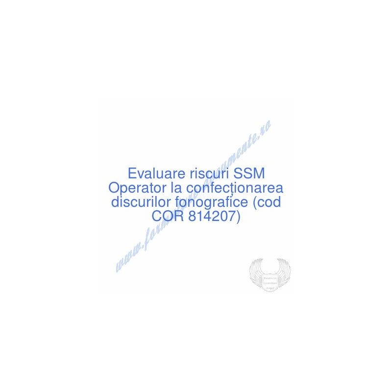 Aceste documente OBLIGATORII pentru ocupantul postului de Operator la confecţionarea discurilor fonografice (cod COR 814207), sunt complet întocmite, respectând cerințele Codului muncii actualizat 2023, Legii securității și sănătății în muncă nr. 319/2006 (actualizată 2023), răspund tuturor cerințelor standardelor de calitate referitoare la management (ISO 9001/ ISO 14001/ ISO 22000/ SR OHSAS 18001:2008/ ISO 45001:2018 etc.). În vederea determinării riscurilor la care este expus angajatul pe funcția de Operator la confecţionarea discurilor fonografice , consecințele maxime previzibile asupra acestuia și metodele de diminuare a lor am folosit metoda elaborată de I.N.C.D.P.M. București, care respectă toate rigorile legale și este unanim acceptată de inspectorii ITM și SSM.