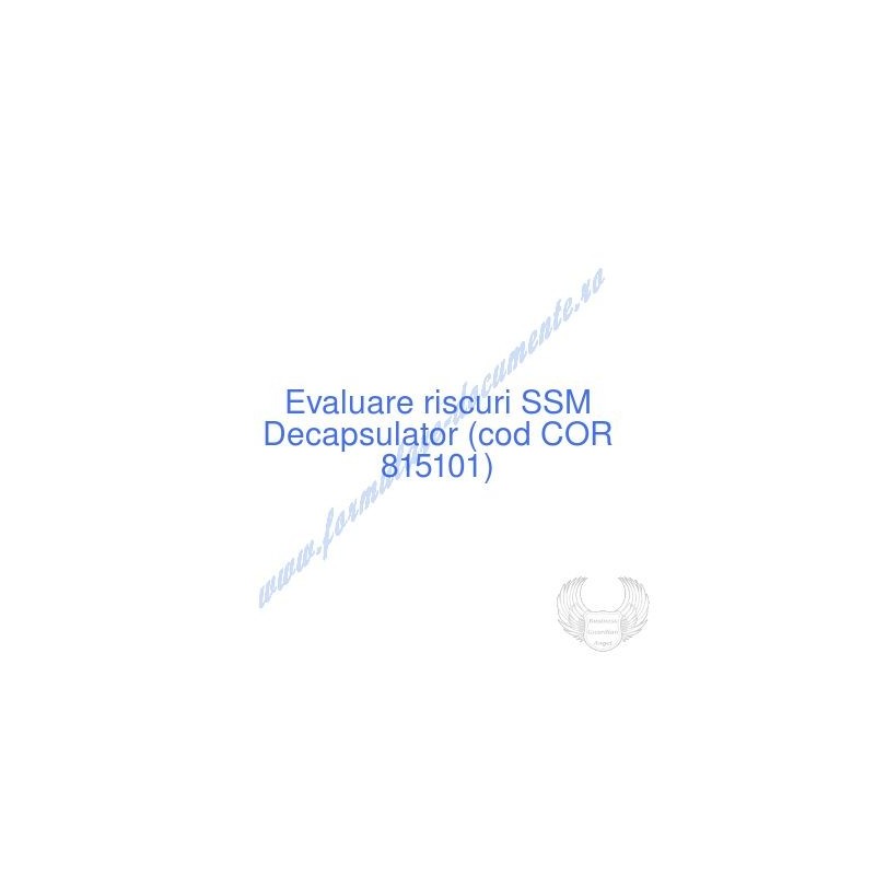 Aceste documente OBLIGATORII pentru ocupantul postului de Decapsulator (cod COR 815101), sunt complet întocmite, respectând cerințele Codului muncii actualizat 2023, Legii securității și sănătății în muncă nr. 319/2006 (actualizată 2023), răspund tuturor cerințelor standardelor de calitate referitoare la management (ISO 9001/ ISO 14001/ ISO 22000/ SR OHSAS 18001:2008/ ISO 45001:2018 etc.). În vederea determinării riscurilor la care este expus angajatul pe funcția de Decapsulator , consecințele maxime previzibile asupra acestuia și metodele de diminuare a lor am folosit metoda elaborată de I.N.C.D.P.M. București, care respectă toate rigorile legale și este unanim acceptată de inspectorii ITM și SSM.