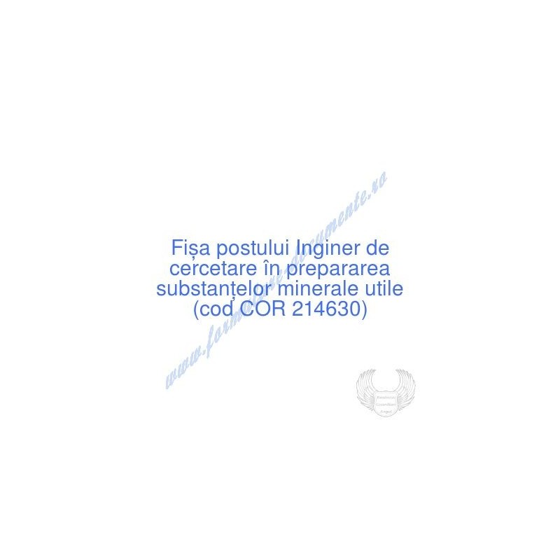 Aceste documente OBLIGATORII pentru ocupantul postului de Inginer de cercetare în prepararea substanţelor minerale utile (cod COR 214630), sunt complet întocmite, respectând cerințele Codului muncii actualizat 2023, Legii securității și sănătății în muncă nr. 319/2006 (actualizată 2023), răspund tuturor cerințelor standardelor de calitate referitoare la management (ISO 9001/ ISO 14001/ ISO 22000 etc.). Aceste documente îndeplinesc cu succes rolul de a ghida salariatul angajat pe funcția de Inginer de cercetare în prepararea substanţelor minerale utile cu privire la atribuțiile și responsabilitățile sale și respectă rigorile legale verificate de inspectorii ITM și SSM.