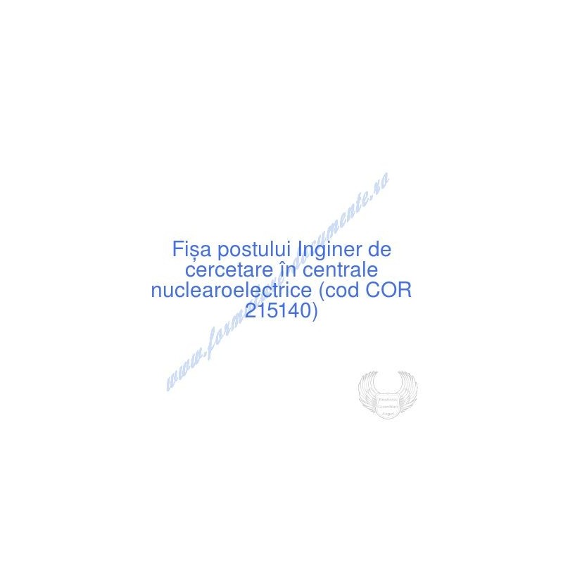 Aceste documente OBLIGATORII pentru ocupantul postului de Inginer de cercetare în centrale nuclearoelectrice (cod COR 215140), sunt complet întocmite, respectând cerințele Codului muncii actualizat 2023, Legii securității și sănătății în muncă nr. 319/2006 (actualizată 2023), răspund tuturor cerințelor standardelor de calitate referitoare la management (ISO 9001/ ISO 14001/ ISO 22000 etc.). Aceste documente îndeplinesc cu succes rolul de a ghida salariatul angajat pe funcția de Inginer de cercetare în centrale nuclearoelectrice cu privire la atribuțiile și responsabilitățile sale și respectă rigorile legale verificate de inspectorii ITM și SSM.