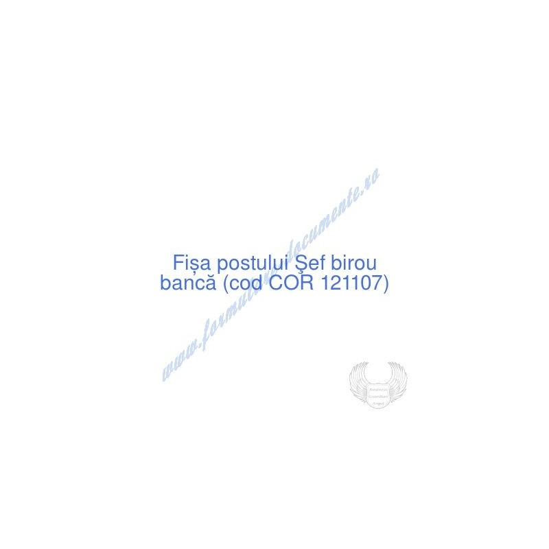 Vă oferim Fişa postului pentru ocupația de Şef birou bancă și Fişă pentru evaluarea anuală a performanțelor individuale ale ocupantului postului de Şef birou bancă, gata redactate, în format editabil DOC, descărcabile direct din contul dvs. de pe site.
