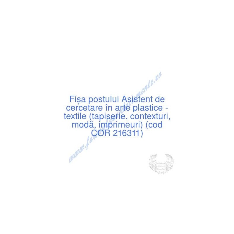 Aceste documente OBLIGATORII pentru ocupantul postului de Asistent de cercetare în arte plastice - textile (tapiserie, contexturi, modă, imprimeuri) (cod COR 216311), sunt complet întocmite, respectând cerințele Codului muncii actualizat 2023, Legii securității și sănătății în muncă nr. 319/2006 (actualizată 2023), răspund tuturor cerințelor standardelor de calitate referitoare la management (ISO 9001/ ISO 14001/ ISO 22000 etc.). Aceste documente îndeplinesc cu succes rolul de a ghida salariatul angajat pe funcția de Asistent de cercetare în arte plastice - textile (tapiserie, contexturi, modă, imprimeuri) cu privire la atribuțiile și responsabilitățile sale și respectă rigorile legale verificate de inspectorii ITM și SSM.