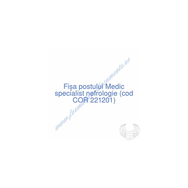 Vă oferim Fişa postului pentru ocupația de Medic specialist nefrologie și Fişă pentru evaluarea anuală a performanțelor individuale ale ocupantului postului de Medic specialist nefrologie, gata redactate, în format editabil DOC, descărcabile direct din contul dvs. de pe site.