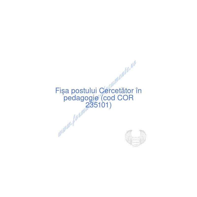 Vă oferim Fişa postului pentru ocupația de Cercetător în pedagogie și Fişă pentru evaluarea anuală a performanțelor individuale ale ocupantului postului de Cercetător în pedagogie, gata redactate, în format editabil DOC, descărcabile direct din contul dvs. de pe site.
