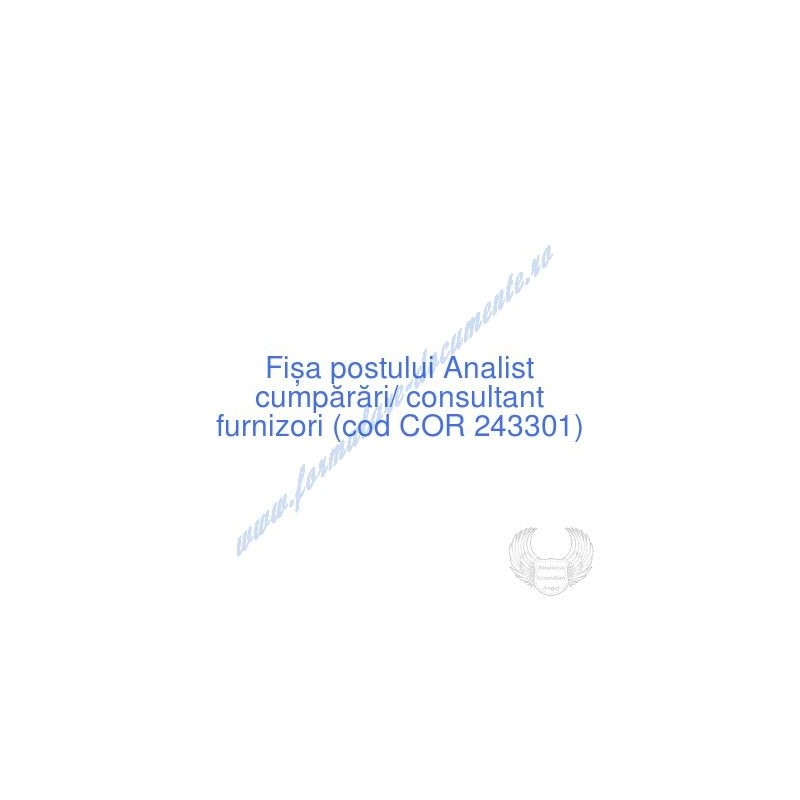 Aceste documente OBLIGATORII pentru ocupantul postului de Analist cumpărări/ consultant furnizori (cod COR 243301), sunt complet întocmite, respectând cerințele Codului muncii actualizat 2023, Legii securității și sănătății în muncă nr. 319/2006 (actualizată 2023), răspund tuturor cerințelor standardelor de calitate referitoare la management (ISO 9001/ ISO 14001/ ISO 22000 etc.). Aceste documente îndeplinesc cu succes rolul de a ghida salariatul angajat pe funcția de Analist cumpărări/ consultant furnizori cu privire la atribuțiile și responsabilitățile sale și respectă rigorile legale verificate de inspectorii ITM și SSM.