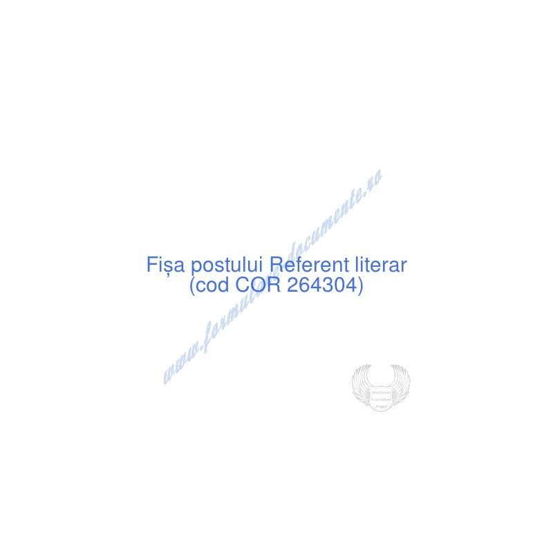 Vă oferim Fişa postului pentru ocupația de Referent literar și Fişă pentru evaluarea anuală a performanțelor individuale ale ocupantului postului de Referent literar, gata redactate, în format editabil DOC, descărcabile direct din contul dvs. de pe site.