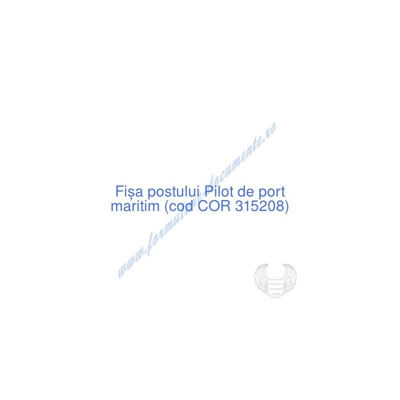 Vă oferim Fişa postului pentru ocupația de Pilot de port maritim și Fişă pentru evaluarea anuală a performanțelor individuale ale ocupantului postului de Pilot de port maritim, gata redactate, în format editabil DOC, descărcabile direct din contul dvs. de pe site.