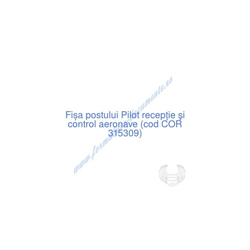 Aceste documente OBLIGATORII pentru ocupantul postului de Pilot recepţie şi control aeronave (cod COR 315309), sunt complet întocmite, respectând cerințele Codului muncii actualizat 2023, Legii securității și sănătății în muncă nr. 319/2006 (actualizată 2023), răspund tuturor cerințelor standardelor de calitate referitoare la management (ISO 9001/ ISO 14001/ ISO 22000 etc.). Aceste documente îndeplinesc cu succes rolul de a ghida salariatul angajat pe funcția de Pilot recepţie şi control aeronave cu privire la atribuțiile și responsabilitățile sale și respectă rigorile legale verificate de inspectorii ITM și SSM.