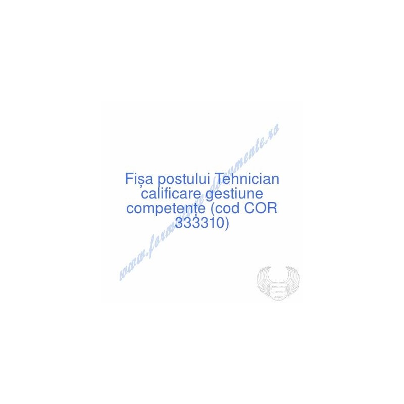 Aceste documente OBLIGATORII pentru ocupantul postului de Tehnician calificare gestiune competenţe (cod COR 333310), sunt complet întocmite, respectând cerințele Codului muncii actualizat 2023, Legii securității și sănătății în muncă nr. 319/2006 (actualizată 2023), răspund tuturor cerințelor standardelor de calitate referitoare la management (ISO 9001/ ISO 14001/ ISO 22000 etc.). Aceste documente îndeplinesc cu succes rolul de a ghida salariatul angajat pe funcția de Tehnician calificare gestiune competenţe cu privire la atribuțiile și responsabilitățile sale și respectă rigorile legale verificate de inspectorii ITM și SSM.