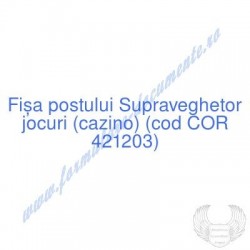 Aceste documente OBLIGATORII pentru ocupantul postului de Supraveghetor jocuri (cazino) (cod COR 421203), sunt complet întocmite, respectând cerințele Codului muncii actualizat 2023, Legii securității și sănătății în muncă nr. 319/2006 (actualizată 2023), răspund tuturor cerințelor standardelor de calitate referitoare la management (ISO 9001/ ISO 14001/ ISO 22000 etc.). Aceste documente îndeplinesc cu succes rolul de a ghida salariatul angajat pe funcția de Supraveghetor jocuri (cazino) cu privire la atribuțiile și responsabilitățile sale și respectă rigorile legale verificate de inspectorii ITM și SSM.