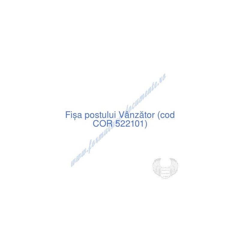 Vă oferim Fişa postului pentru ocupația de Vânzător și Fişă pentru evaluarea anuală a performanțelor individuale ale ocupantului postului de Vânzător, gata redactate, în format editabil DOC, descărcabile direct din contul dvs. de pe site.