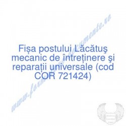 Aceste documente OBLIGATORII pentru ocupantul postului de Lăcătuş mecanic de întreţinere şi reparaţii universale (cod COR 721424), sunt complet întocmite, respectând cerințele Codului muncii actualizat 2023, Legii securității și sănătății în muncă nr. 319/2006 (actualizată 2023), răspund tuturor cerințelor standardelor de calitate referitoare la management (ISO 9001/ ISO 14001/ ISO 22000 etc.). Aceste documente îndeplinesc cu succes rolul de a ghida salariatul angajat pe funcția de Lăcătuş mecanic de întreţinere şi reparaţii universale cu privire la atribuțiile și responsabilitățile sale și respectă rigorile legale verificate de inspectorii ITM și SSM.