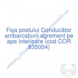 Aceste documente OBLIGATORII pentru ocupantul postului de Conducător ambarcaţiuni agrement pe ape interioare (cod COR 835004), sunt complet întocmite, respectând cerințele Codului muncii actualizat 2023, Legii securității și sănătății în muncă nr. 319/2006 (actualizată 2023), răspund tuturor cerințelor standardelor de calitate referitoare la management (ISO 9001/ ISO 14001/ ISO 22000 etc.). Aceste documente îndeplinesc cu succes rolul de a ghida salariatul angajat pe funcția de Conducător ambarcaţiuni agrement pe ape interioare cu privire la atribuțiile și responsabilitățile sale și respectă rigorile legale verificate de inspectorii ITM și SSM.