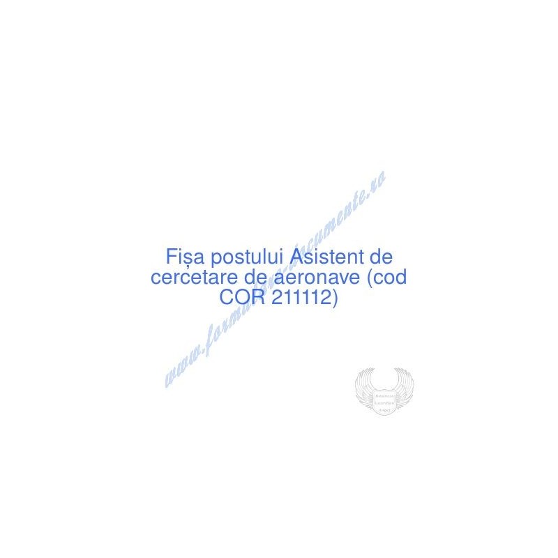 Aceste documente OBLIGATORII pentru ocupantul postului de Asistent de cercetare de aeronave (cod COR 211112), sunt complet întocmite, respectând cerințele Codului muncii actualizat 2023, Legii securității și sănătății în muncă nr. 319/2006 (actualizată 2023), răspund tuturor cerințelor standardelor de calitate referitoare la management (ISO 9001/ ISO 14001/ ISO 22000 etc.). Aceste documente îndeplinesc cu succes rolul de a ghida salariatul angajat pe funcția de Asistent de cercetare de aeronave cu privire la atribuțiile și responsabilitățile sale și respectă rigorile legale verificate de inspectorii ITM și SSM.