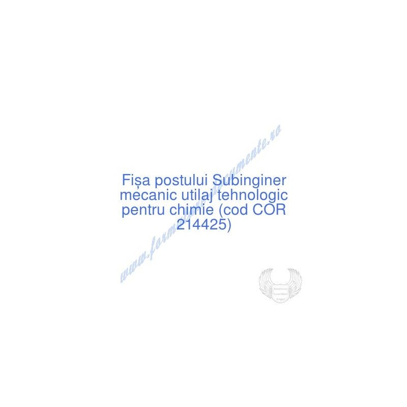 Aceste documente OBLIGATORII pentru ocupantul postului de Subinginer mecanic utilaj tehnologic pentru chimie (cod COR 214425), sunt complet întocmite, respectând cerințele Codului muncii actualizat 2023, Legii securității și sănătății în muncă nr. 319/2006 (actualizată 2023), răspund tuturor cerințelor standardelor de calitate referitoare la management (ISO 9001/ ISO 14001/ ISO 22000 etc.). Aceste documente îndeplinesc cu succes rolul de a ghida salariatul angajat pe funcția de Subinginer mecanic utilaj tehnologic pentru chimie cu privire la atribuțiile și responsabilitățile sale și respectă rigorile legale verificate de inspectorii ITM și SSM.