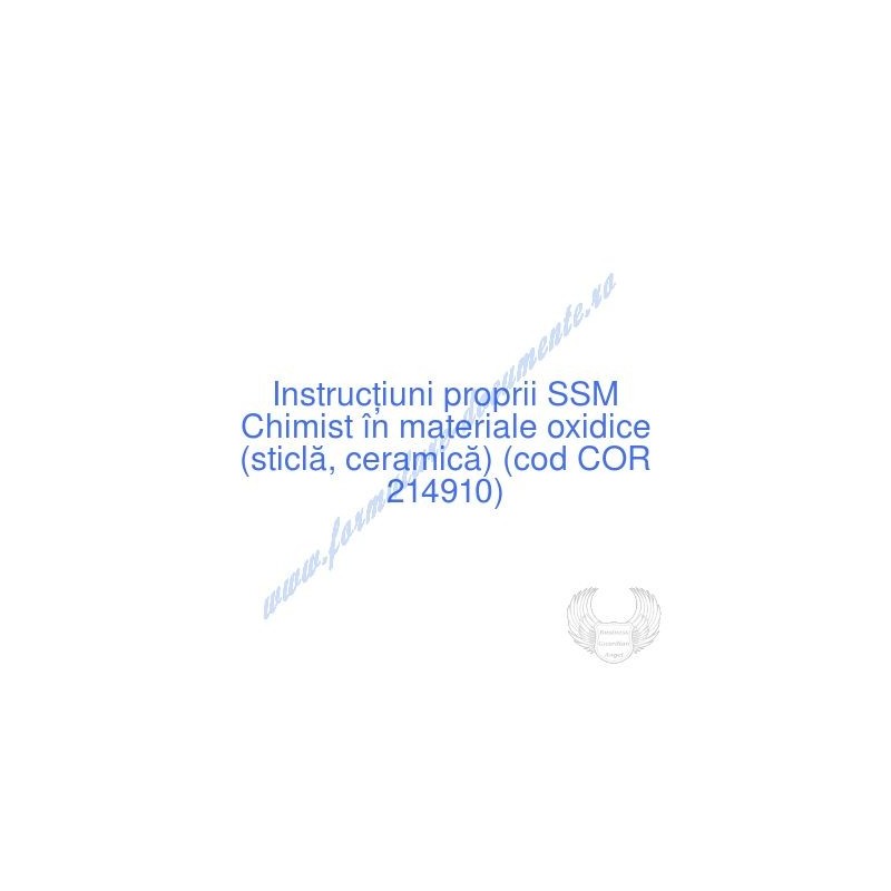 Aceste documente OBLIGATORII pentru ocupantul postului de Chimist în materiale oxidice (sticlă, ceramică) (cod COR 214910), sunt complet întocmite, respectând cerințele Codului muncii actualizat 2023, Legii securității și sănătății în muncă nr. 319/2006 (actualizată 2023), H.G. 1425/2006 (actualizată 2023) și răspund tuturor cerințelor standardelor de calitate referitoare la management (ISO 9001/ ISO 14001/ ISO 22000/ SR OHSAS 18001:2008/ ISO 45001:2018 etc.). Cuprinsul IPSSM pentru instruirea angajatului pe funcția de Chimist în materiale oxidice (sticlă, ceramică) :