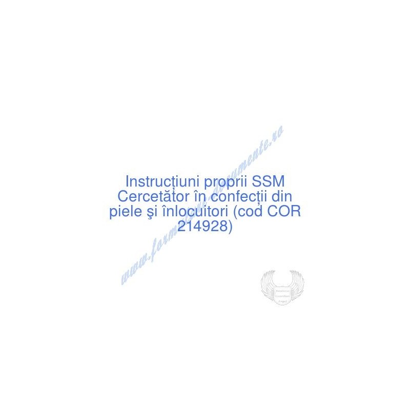 Aceste documente OBLIGATORII pentru ocupantul postului de Cercetător în confecţii din piele şi înlocuitori (cod COR 214928), sunt complet întocmite, respectând cerințele Codului muncii actualizat 2023, Legii securității și sănătății în muncă nr. 319/2006 (actualizată 2023), H.G. 1425/2006 (actualizată 2023) și răspund tuturor cerințelor standardelor de calitate referitoare la management (ISO 9001/ ISO 14001/ ISO 22000/ SR OHSAS 18001:2008/ ISO 45001:2018 etc.). Cuprinsul IPSSM pentru instruirea angajatului pe funcția de Cercetător în confecţii din piele şi înlocuitori :