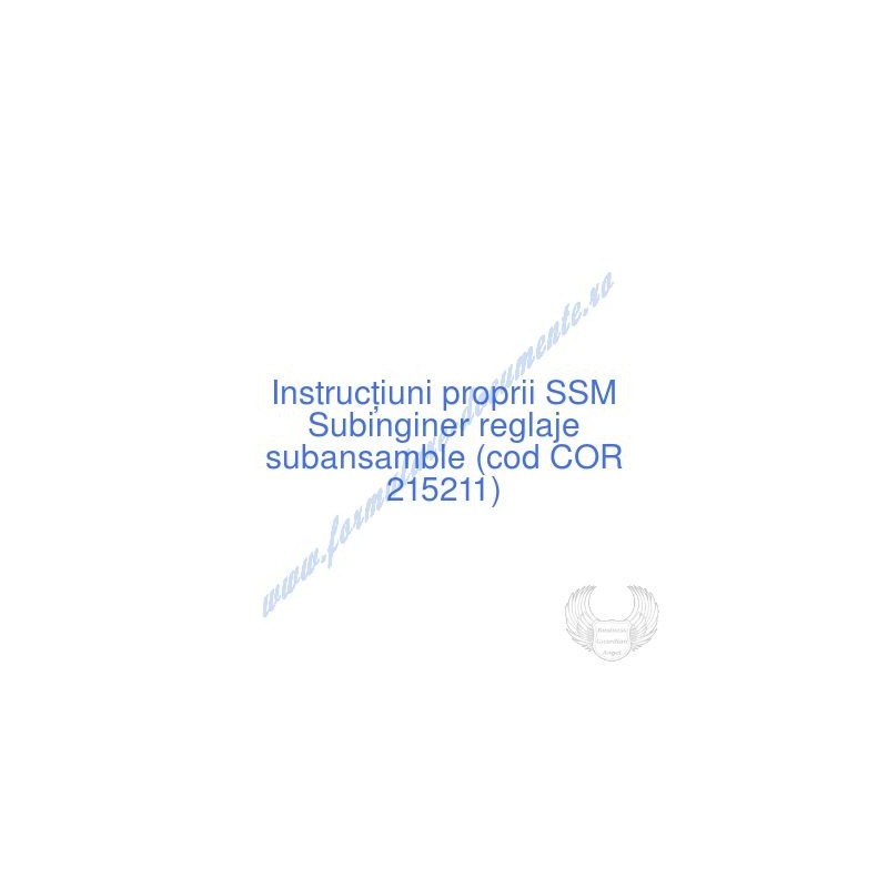 Aceste documente OBLIGATORII pentru ocupantul postului de Subinginer reglaje subansamble (cod COR 215211), sunt complet întocmite, respectând cerințele Codului muncii actualizat 2023, Legii securității și sănătății în muncă nr. 319/2006 (actualizată 2023), H.G. 1425/2006 (actualizată 2023) și răspund tuturor cerințelor standardelor de calitate referitoare la management (ISO 9001/ ISO 14001/ ISO 22000/ SR OHSAS 18001:2008/ ISO 45001:2018 etc.). Cuprinsul IPSSM pentru instruirea angajatului pe funcția de Subinginer reglaje subansamble :