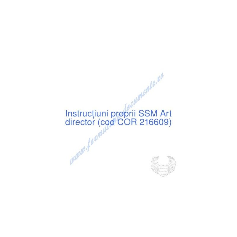 Aceste documente OBLIGATORII pentru ocupantul postului de Art director (cod COR 216609), sunt complet întocmite, respectând cerințele Codului muncii actualizat 2023, Legii securității și sănătății în muncă nr. 319/2006 (actualizată 2023), H.G. 1425/2006 (actualizată 2023) și răspund tuturor cerințelor standardelor de calitate referitoare la management (ISO 9001/ ISO 14001/ ISO 22000/ SR OHSAS 18001:2008/ ISO 45001:2018 etc.). Cuprinsul IPSSM pentru instruirea angajatului pe funcția de Art director :
