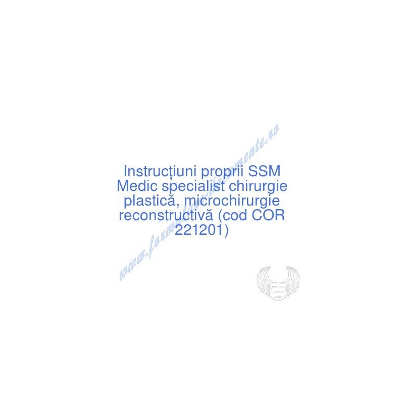 Aceste documente OBLIGATORII pentru ocupantul postului de Medic specialist chirurgie plastică, microchirurgie reconstructivă (cod COR 221201), sunt complet întocmite, respectând cerințele Codului muncii actualizat 2023, Legii securității și sănătății în muncă nr. 319/2006 (actualizată 2023), H.G. 1425/2006 (actualizată 2023) și răspund tuturor cerințelor standardelor de calitate referitoare la management (ISO 9001/ ISO 14001/ ISO 22000/ SR OHSAS 18001:2008/ ISO 45001:2018 etc.). Cuprinsul IPSSM pentru instruirea angajatului pe funcția de Medic specialist chirurgie plastică, microchirurgie reconstructivă :