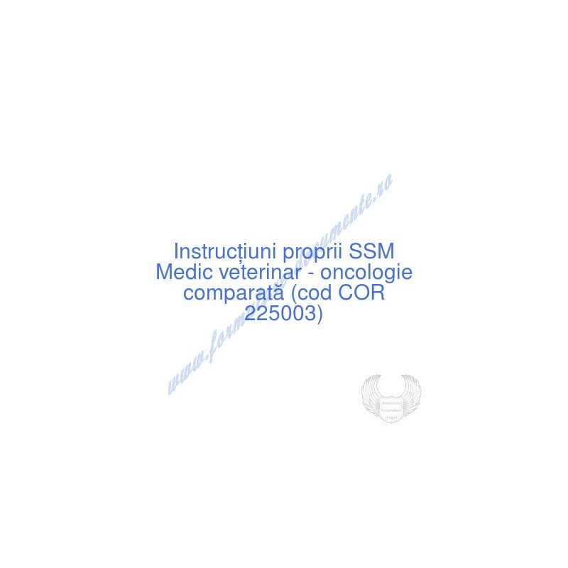 Aceste documente OBLIGATORII pentru ocupantul postului de Medic veterinar - oncologie comparată (cod COR 225003), sunt complet întocmite, respectând cerințele Codului muncii actualizat 2023, Legii securității și sănătății în muncă nr. 319/2006 (actualizată 2023), H.G. 1425/2006 (actualizată 2023) și răspund tuturor cerințelor standardelor de calitate referitoare la management (ISO 9001/ ISO 14001/ ISO 22000/ SR OHSAS 18001:2008/ ISO 45001:2018 etc.). Cuprinsul IPSSM pentru instruirea angajatului pe funcția de Medic veterinar - oncologie comparată :