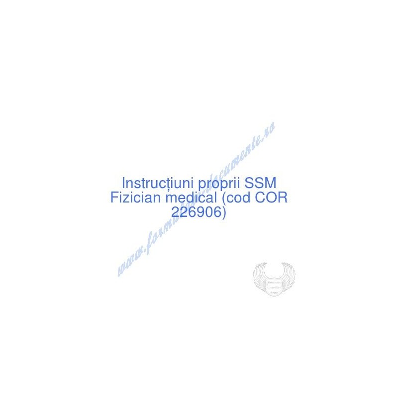 Aceste documente OBLIGATORII pentru ocupantul postului de Fizician medical (cod COR 226906), sunt complet întocmite, respectând cerințele Codului muncii actualizat 2023, Legii securității și sănătății în muncă nr. 319/2006 (actualizată 2023), H.G. 1425/2006 (actualizată 2023) și răspund tuturor cerințelor standardelor de calitate referitoare la management (ISO 9001/ ISO 14001/ ISO 22000/ SR OHSAS 18001:2008/ ISO 45001:2018 etc.). Cuprinsul IPSSM pentru instruirea angajatului pe funcția de Fizician medical :