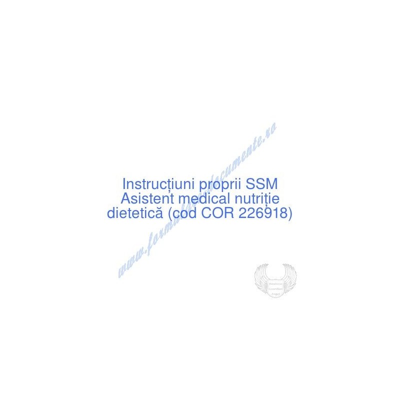 Aceste documente OBLIGATORII pentru ocupantul postului de Asistent medical nutriție dietetică (cod COR 226918), sunt complet întocmite, respectând cerințele Codului muncii actualizat 2023, Legii securității și sănătății în muncă nr. 319/2006 (actualizată 2023), H.G. 1425/2006 (actualizată 2023) și răspund tuturor cerințelor standardelor de calitate referitoare la management (ISO 9001/ ISO 14001/ ISO 22000/ SR OHSAS 18001:2008/ ISO 45001:2018 etc.). Cuprinsul IPSSM pentru instruirea angajatului pe funcția de Asistent medical nutriție dietetică :