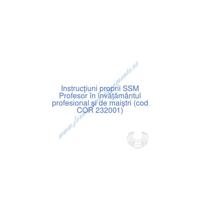 Aceste documente OBLIGATORII pentru ocupantul postului de Profesor în învăţământul profesional şi de maiştri (cod COR 232001), sunt complet întocmite, respectând cerințele Codului muncii actualizat 2023, Legii securității și sănătății în muncă nr. 319/2006 (actualizată 2023), H.G. 1425/2006 (actualizată 2023) și răspund tuturor cerințelor standardelor de calitate referitoare la management (ISO 9001/ ISO 14001/ ISO 22000/ SR OHSAS 18001:2008/ ISO 45001:2018 etc.). Cuprinsul IPSSM pentru instruirea angajatului pe funcția de Profesor în învăţământul profesional şi de maiştri :