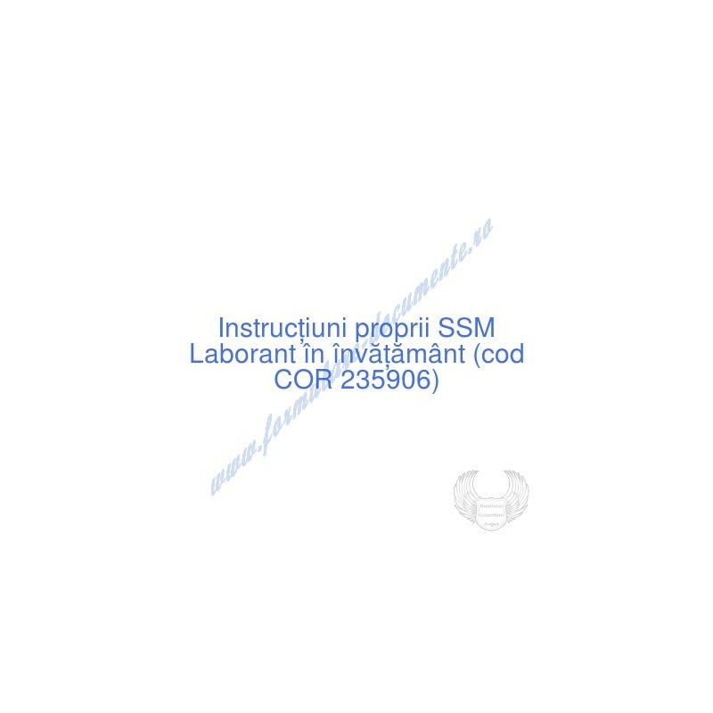 Aceste documente OBLIGATORII pentru ocupantul postului de Laborant în învăţământ (cod COR 235906), sunt complet întocmite, respectând cerințele Codului muncii actualizat 2023, Legii securității și sănătății în muncă nr. 319/2006 (actualizată 2023), H.G. 1425/2006 (actualizată 2023) și răspund tuturor cerințelor standardelor de calitate referitoare la management (ISO 9001/ ISO 14001/ ISO 22000/ SR OHSAS 18001:2008/ ISO 45001:2018 etc.). Cuprinsul IPSSM pentru instruirea angajatului pe funcția de Laborant în învăţământ :